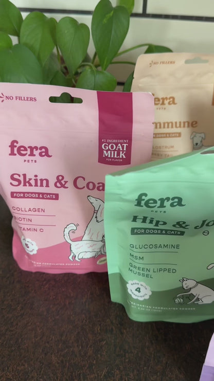 Introducing Fera’s Goat Milk Toppers for dogs and cats, designed for extra healthy deliciousness. With Goat Milk as the #1 ingredient, these meal toppers are great for picky eaters, because pets love the cheesy smell and appetizing taste. It’s the easy (and yummy) way to level up your pet’s daily meals! Our Goat Milk MULTIVITAMIN formula features whole cream goat’s milk for irresistible flavor, combined with essential vitamins and minerals plus probiotics—all designed to meet your pet’s nutritional needs.