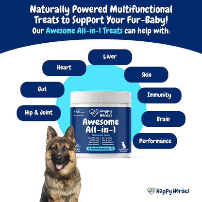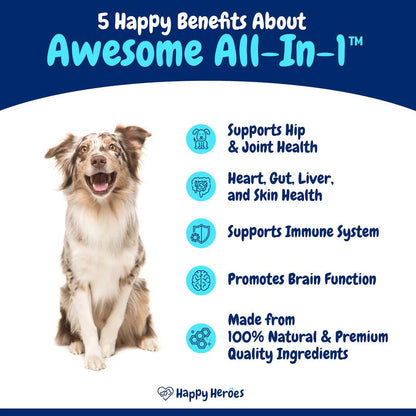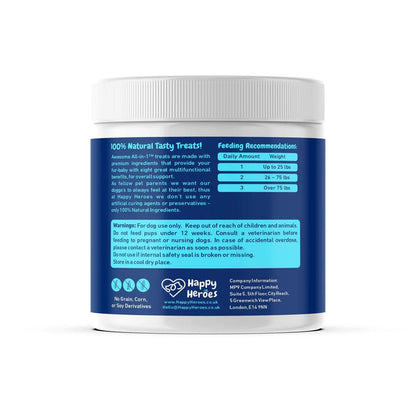 Happy Heroes Awesome All-In-1 presents a premium line of dog multivitamin treats meticulously designed to offer comprehensive support for both small and large breeds.