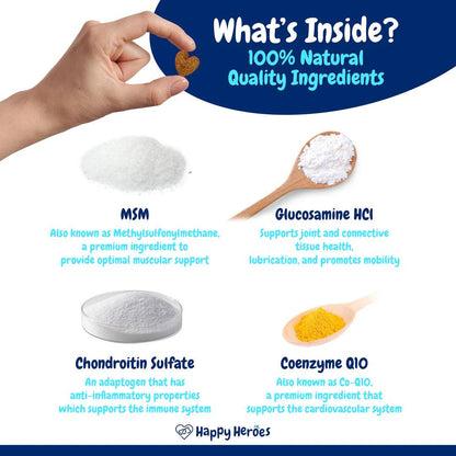 Active Ingredients: Glucosamine, MSM, Chondroitin Sulfate, Cranberry, Coenzyme Q10, Curcumin Rhizome Extract, Vitamin A, Vitamin D3, Vitamin E, Vitamin C, Vitamin B1 Thiamine, Vitamin B2 Riboflavin, Vitamin B6 Pyridoxine, Calcium pantothenate, Nicotinamide, Folic Acid, Lutein, Biotin, Vitamin B12 Cyanocobalamine, Compound minerals (zinc, manganese, selenium, copper, iron, calcium, phosphorus, potassium, sodium, iodine), Gut Health Blend (Amylase, Protease, Lipase, Cellulase, Lactase, Bromelain), Compound probiotic